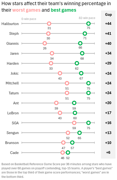 In Haliburton’s best box score games this season, the Pacers have played like a 75-win team. In his worst, the Pacers have played like a 31-win team—a gap of 44 wins, the largest gap in team performance for any of the playoff-bound stars this year. Indiana swings from winning games by 15 on average, to losing them by 6—again, the largest such swing among the fourteen stars shown.