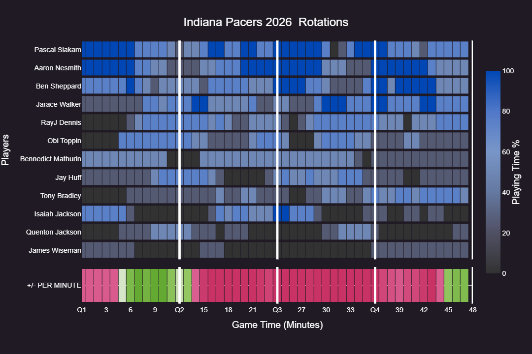 When we’re talking centers, that means Jay Huff, Isaiah Jackson, James Wiseman, Tony Bradley, the injured Obi Toppin, and I’d argue Jarace Walker. There had been lineups with two of them in, but in these limited sample sizes, it makes more sense to call Walker an option at center when he’s been in the most used small-ball lineup without a traditional center, closed the Mavericks game with no center and no Toppin, and the Pacers have rarely closed with one of their traditional centers through their first four games—the one exception coming in the Wolves game where Toppin got injured.